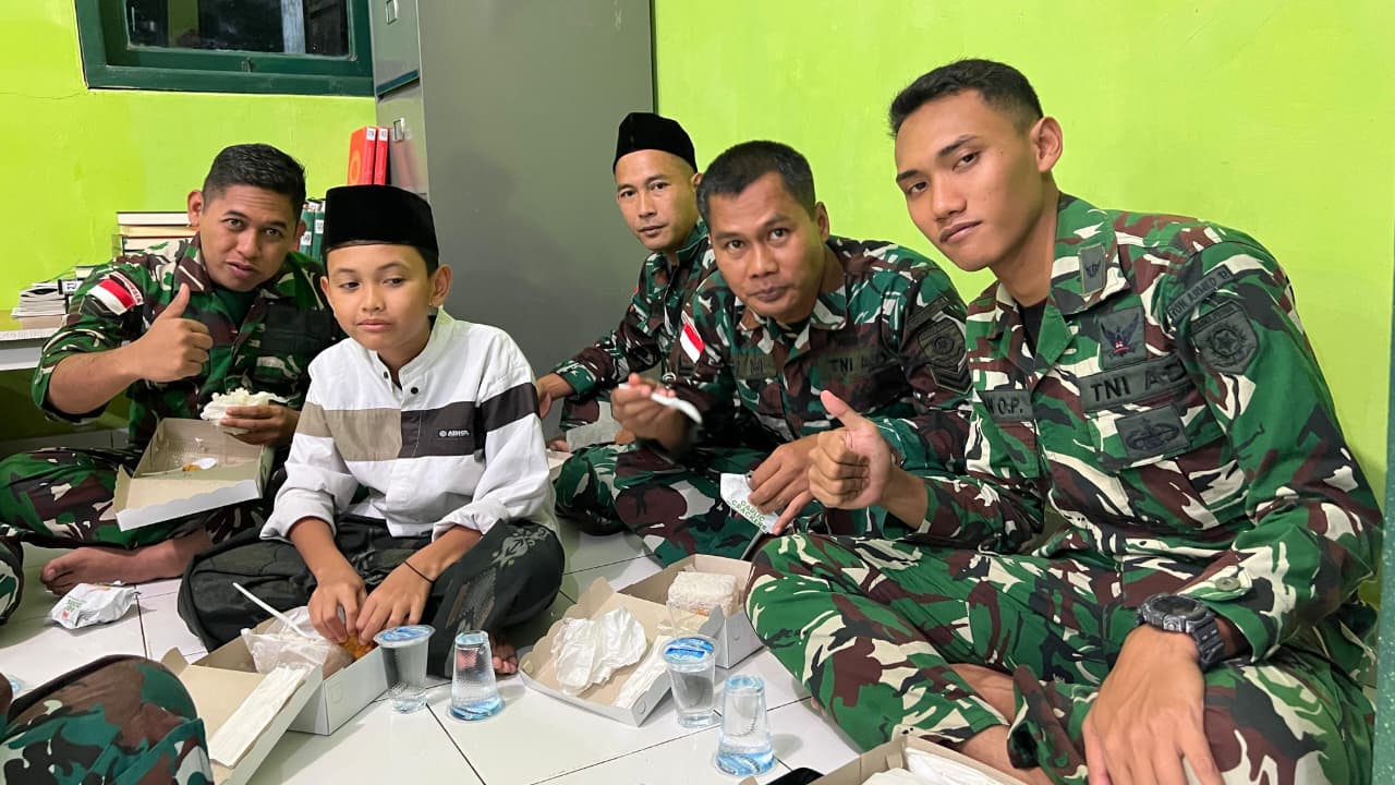 Tepat pukul 18.06 WITA, prajurit dan para santri melaksanakan buka puasa bersama dalam suasana hangat dan penuh kekeluargaan. Kebersamaan semakin terasa saat seluruh peserta duduk berdampingan menikmati hidangan berbuka, mencerminkan kedekatan tanpa sekat antara TNI dan masyarakat.