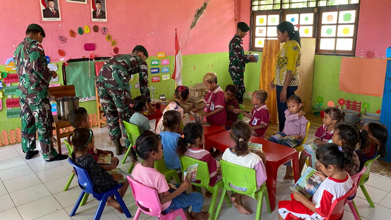 Belu – Satgas Pamtas RI–RDTL Sektor Timur Yonarmed 12 Kostrad Pos Turiskain melaksanakan kegiatan pengajaran yang dirangkaikan dengan pembagian bubur kacang hijau kepada anak-anak PAUD Lorosa’e, Desa Maumutin, Kecamatan Raihat, Kabupaten Belu, Provinsi NTT, Sabtu (7/2/2026). Kegiatan ini merupakan bentuk kepedulian Satgas terhadap pendidikan dan kesehatan anak-anak di wilayah perbatasan.
