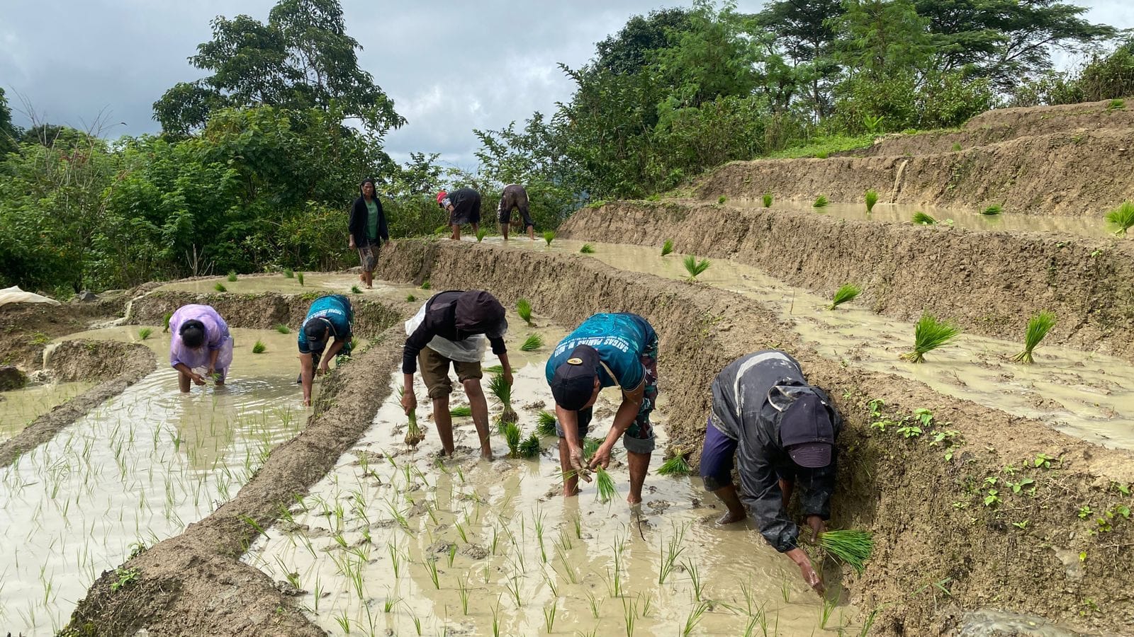 Kehadiran personel Pos Laktutus disambut antusias warga yang bersama-sama turun ke sawah untuk mempercepat proses tanam. Semangat kebersamaan terlihat jelas, mencerminkan kemanunggalan TNI dengan rakyat dalam mendukung sektor pertanian lokal.